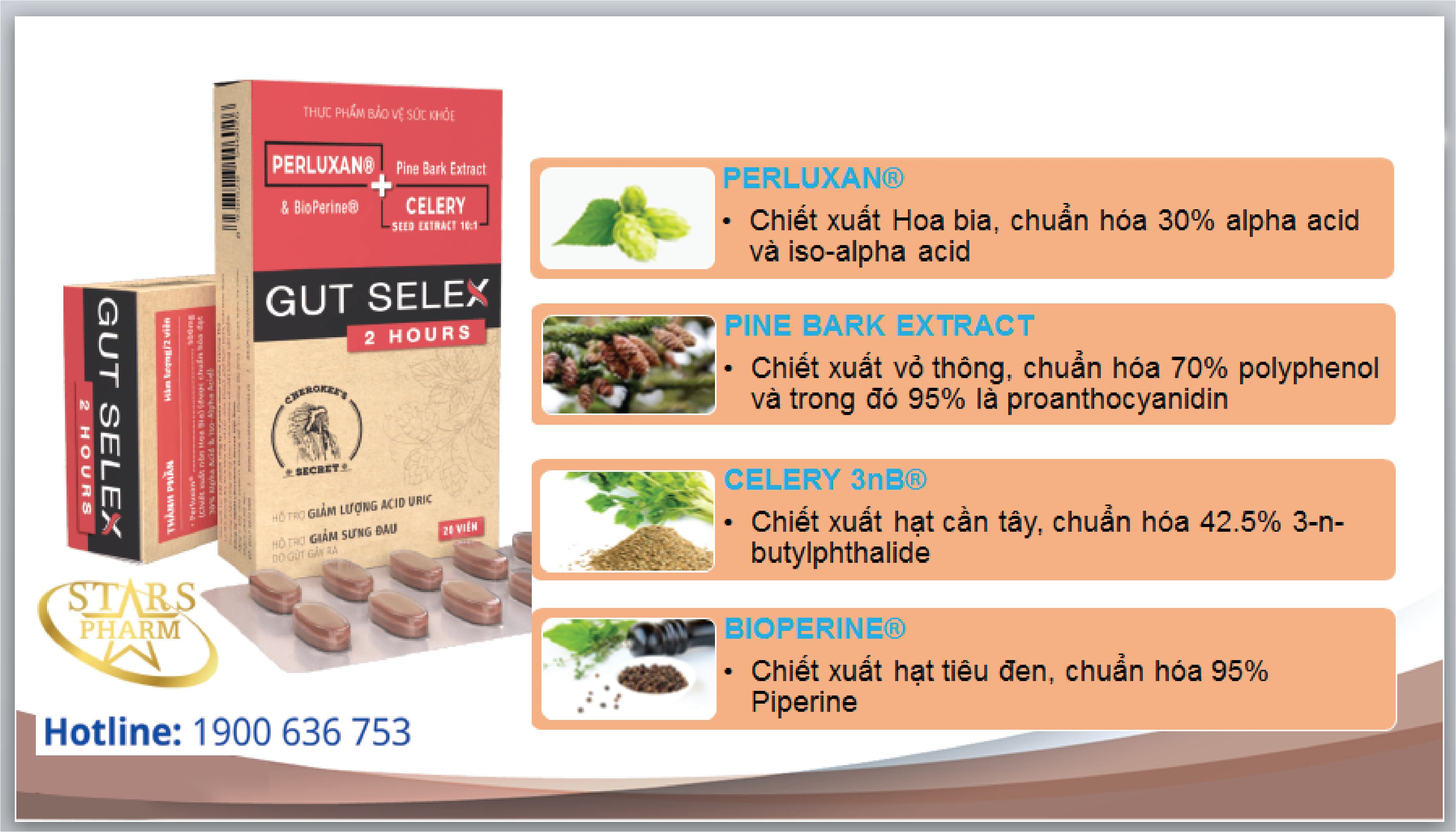 Với sự kết hợp từ Perluxan – chiết xuất nón hoa bia, Celery 3nB – chiết xuất hạt cần tây, Pine Bark extract – chiết xuất vỏ thông biển, Bioperine – chiết xuất tiêu đen, Gut Selex 2 hours là giải pháp toàn diện giúp bệnh nhân gút vừa giảm sưng đau, vừa đào thải acid uric cùng lúc, từ đó không còn lo các cơn đau tái đi tái lại, thận không bị tổn thương, không cần lo ăn kiêng… để lấy lại sức mạnh thể chất, tinh thần và tận hưởng cuộc sống. Sản phẩm thích hợp sử dụng cho người bệnh gút hoặc có lượng acid uric cao.