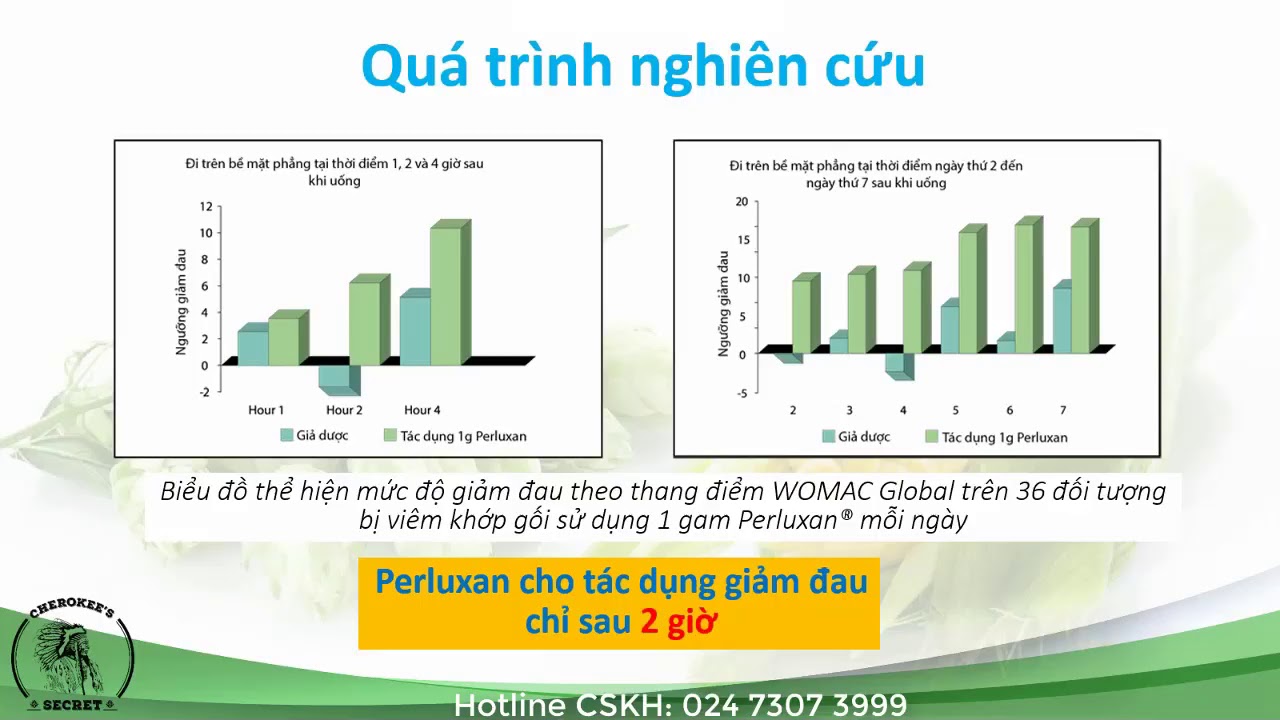 Lý giải đột phá công dụng của Perluxan trong việc giảm đau an toàn, tác động kháng viêm, tiêu viêm phục hồi tình trạng khớp xương viêm hoặc thoái hóa, gút bởi vì dưỡng chất này sau khi uống vào cơ thể từ 2 giờ sẽ được hấp thu, nhanh chóng có mặt ở mô liên kết tại sụn và khớp xương giảm đau nhanh và kéo dài đến 8 giờ, không như các thuốc giảm đau kháng viêm tân dược thường tác dụng rất nhanh nhưng cũng nhanh hết tác dụng. Đồng thời, Alpha Axit và Iso Alpha Axit trong Perluxan tác động đến vị trí khớp viêm, sưng giúp tiêu viêm, kháng viêm rút ngắn thời gian sử dụng các chất kháng viêm giảm đau không steroid, làm chậm quá trình thoái hóa khớp, viêm đau do bệnh viêm khớp từ gốc. Bên cạnh đó, sự phối kết hợp cùng hoạt chất GreenGrown Glucosamine chiết xuất từ ngô không biến đổi gen giúp tái tạo mô sụn khớp, giúp khớp vận động linh hoạt mang lại công dụng toàn diện 2 trong 1 cho người bệnh xương khớp.